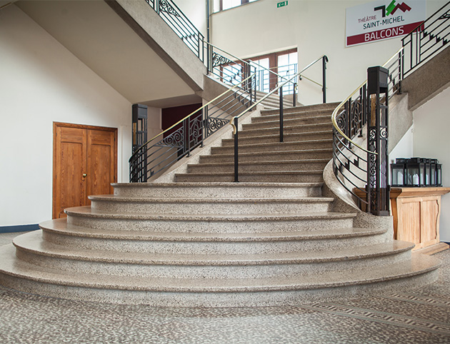 La décoration se distingue par un cadre de scène noir et rectiligne, des garde-corps en ferronnerie, des moulures en béton armé et des luminaires géométriques qui rythment murs et plafonds. Le hall monumental, avec son escalier en granit, guide le spectateur vers les balcons, tandis qu’un bar restauré en 2013 mène à un salon transformable en petite salle de 70 places.